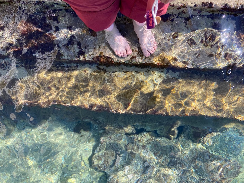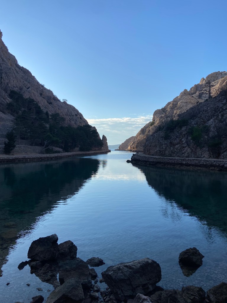 Über die Landstraße reisend wechselten unsere Mitfahrgelegenheiten häufiger, da es nun von Ortschaft zu Ortschaft ging. Insgesamt schafften wir es so aber recht schnell rund 90 km mit vier Autos bis zu einem kleinen Küstenort zurückzulegen. Ein Pärchen sammelte uns zuletzt ein und nahm uns mit an diesen beschaulichen verschlafenen Ort namens Jablanac, wo wir eine Mittagspause bei strahlendem Sonnenschein und das erste Mittelmeerfußbad verbrachten. Das Paar schaute sich eine Sehenswürdigkeit an: In einer der kleinen Buchten lag ein versunkenes Schiffwrack aus dem Zweiten Weltkrieg. Sie wollten uns im Anschluss wieder zurück zur Hauptstraße nehmen. Pünktlich zur verabredeten Zeit sahen wir sie mit ihrem wirklich süßen Labradoodle heran laufen und sie fuhren uns die vier km den kurvigen Serpentinenweg wieder hinauf.