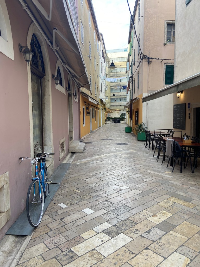 Neben dem hiesigen Touristenprogramm stand für uns vor allem eins auf unserer Tagesordnung: Wäsche waschen. Leos Waschmaschine war Nani zu suspekt, da Leo weder Waschmittel besaß noch sonst einen Hinweis darauf zu finden war, dass das Gerät in jüngster Vergangenheit in Betrieb genommen wurde. Da der Wasserschlauch bereits leicht defekt war und tropfte, entschieden wir uns den abzusehenden Wasserschaden lieber zu vermeiden und dafür eine Stunde im örtlichen Waschsalon rumzuhängen. Hier trafen wir einen lieben Kroaten, der ebenfalls seine Wäsche trockneten und unterhielten uns über Land, Leute, Reisen und sonstige Banalitäten. Die kroatische Offenherzigkeit mit jedem und überall ein Gespräch zu beginnen, einfach weil man sich gerade begegnet, sagte besonders Nani sehr zu. Wir verabschiedeten uns und machten uns auf die Altstadt zu erkunden. Wir streiften durch die Gassen und gelangten schließlich an eins der Highlights der Stadt. Die Stufen der Promenade wurden mit Hohlräumen gebaut, sodass eine sogenannte Meeresorgel entsteht. Die Wellen des Meeres erzeugen so einen Klang, der an eine Orgel bzw Wahlgesänge erinnerte. Hör doch mal rein!