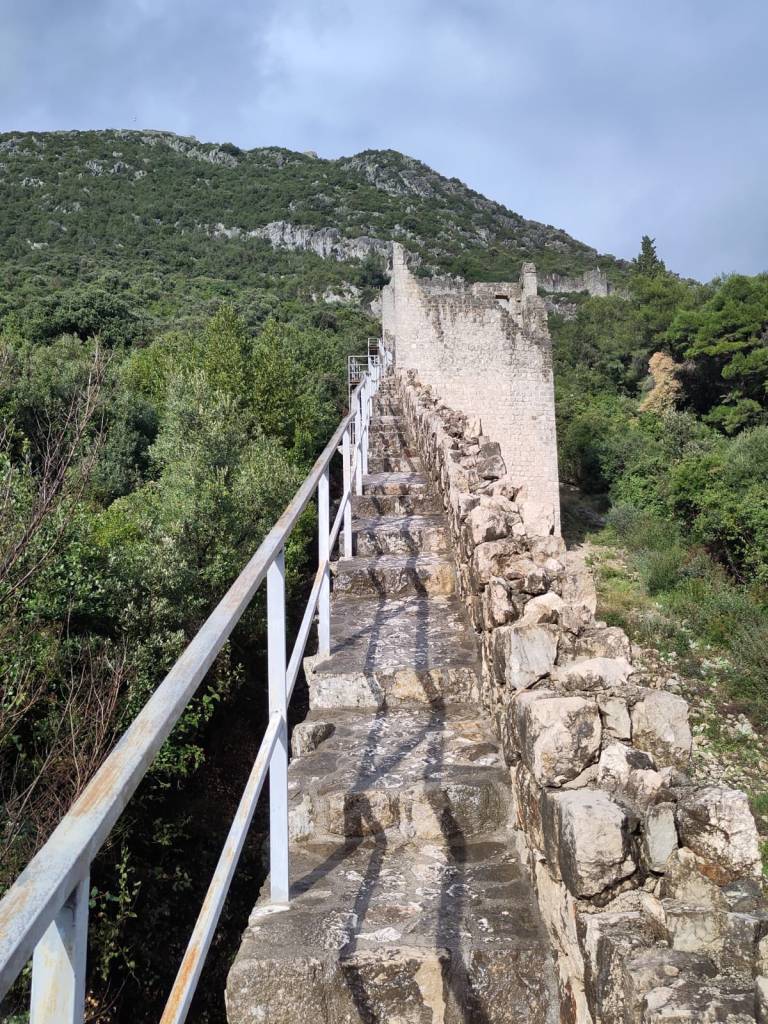 Die Nacht war schön ruhig. Allerdings bemerkte ods irgendwann, dass es auf den Balkonvorsprung regnete und das Wasser von dort langsam im Raum und unter dem Lattenrost ausbreitete. Das Lattenrost war zum Glück erhöht, doch kam die Befürchtung auf, dass der Rucksack in einer Pfütze liegt. Doch zum Glück lagen alle Sachen trocken. Am nächsten Morgen gab es Frühstück auf dem Balkon bei herrlichem Ausblick , ehe ods sich wieder an die Straße stellte. Nach einiger Zeit hielt ein Truckfahrer, der anbot, ods in Ston rauszulassen. Das passte perfekt, denn schon vor einigen Tagen wurde von jemandem der Ort als sehr sehenswert empfohlen, denn das Highlight von Ston war neben den niedlichen historischen Gassen die Stadtmauer, die über einen Hügel bis zu zum nächsten Ort reichte und irgendwie an die Chinesische Mauer erinnerte. Als wohl einziger Tourist des Tages bestieg ods die Mauer. Oben angekommen überlegte er lange, ob es sich wohl lohnen würde, hier oben oder in einem der Türme übernachten zu können. Der Ticketverkäufer am Eingang wirkte nicht sonderlich motiviert, als dass er abends hier entlanglaufen und kontrollieren würde. Ods entschied sich dann aber doch dagegen, denn kein Turm hatte ein Dach und da es wieder eine regnerische Nacht werden sollte, wollte er sich einen etwas geschützteren Schlafplatz suchen. Außerdem war es noch nicht so spät, sodass man vielleicht noch ein Stück weiter getrampt kam. Zudem meldete Nani kurz, dass sie bereits in Dubrovnik angekommen ist. Vom Ehrgeiz gepackt ging ods also auf der anderen Seite der Mauer wieder herunter und stellte sich an die kleine Dorfstraße.