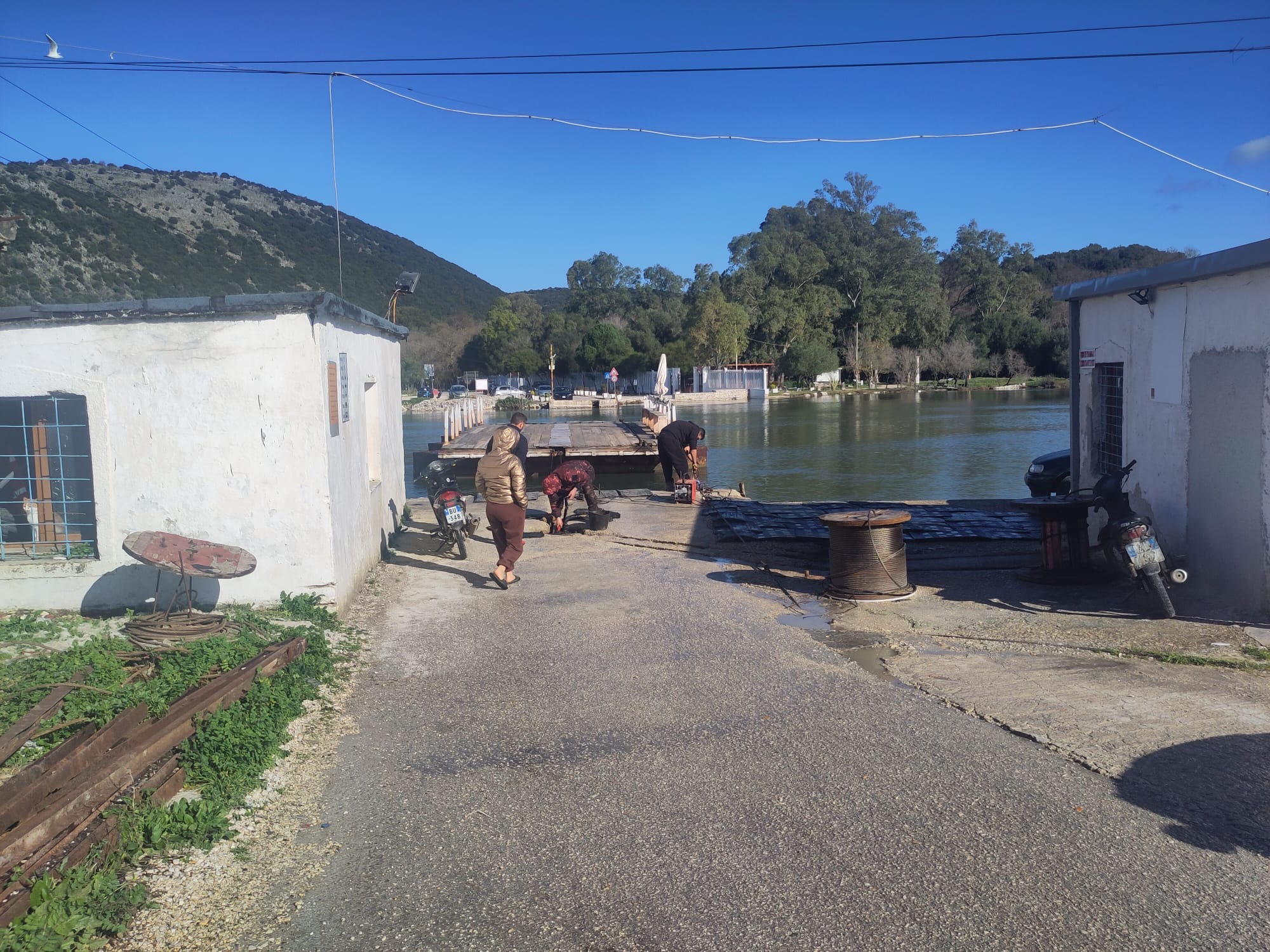 Am folgenden Morgen frühstückten wir entspannt auf der Burgmauer, als ein Sicherheitsmann das Tor wieder aufschloss. Er war sichtlich verwirrt über unsere Anwesenheit und schaute uns fragend an. Er schien selbst nicht genau zu wissen wie er mit der Situation umzugehen hat, sodass wir uns schnell vom Hof machten und uns auf dem Weg nach draußen noch bei ihm dafür bedankten, dass er das Tor wieder aufgemacht hatte. Belustigt von der Situation gingen wir zurück zur Fähre, um uns die archäologischen Ruinen der alten Stadt Butrint anzusehen! Doch die Seilfähre hatte einen kleinen Defekt und mehrere Männer arbeiteten gerade daran. Die verlängerte Wartezeit nutzten wir, um die hiesigen Hunde mit drei sehr niedlichen Welpen zu streicheln. Die Ruinen von Butrinit waren eine beeindruckende Sehenswürdigkeit und wir verbrachten den gesamten Vormittag und Mittag dort ehe wir uns auf den Weg ins Landesinnere Richtung griechische Grenze machten.