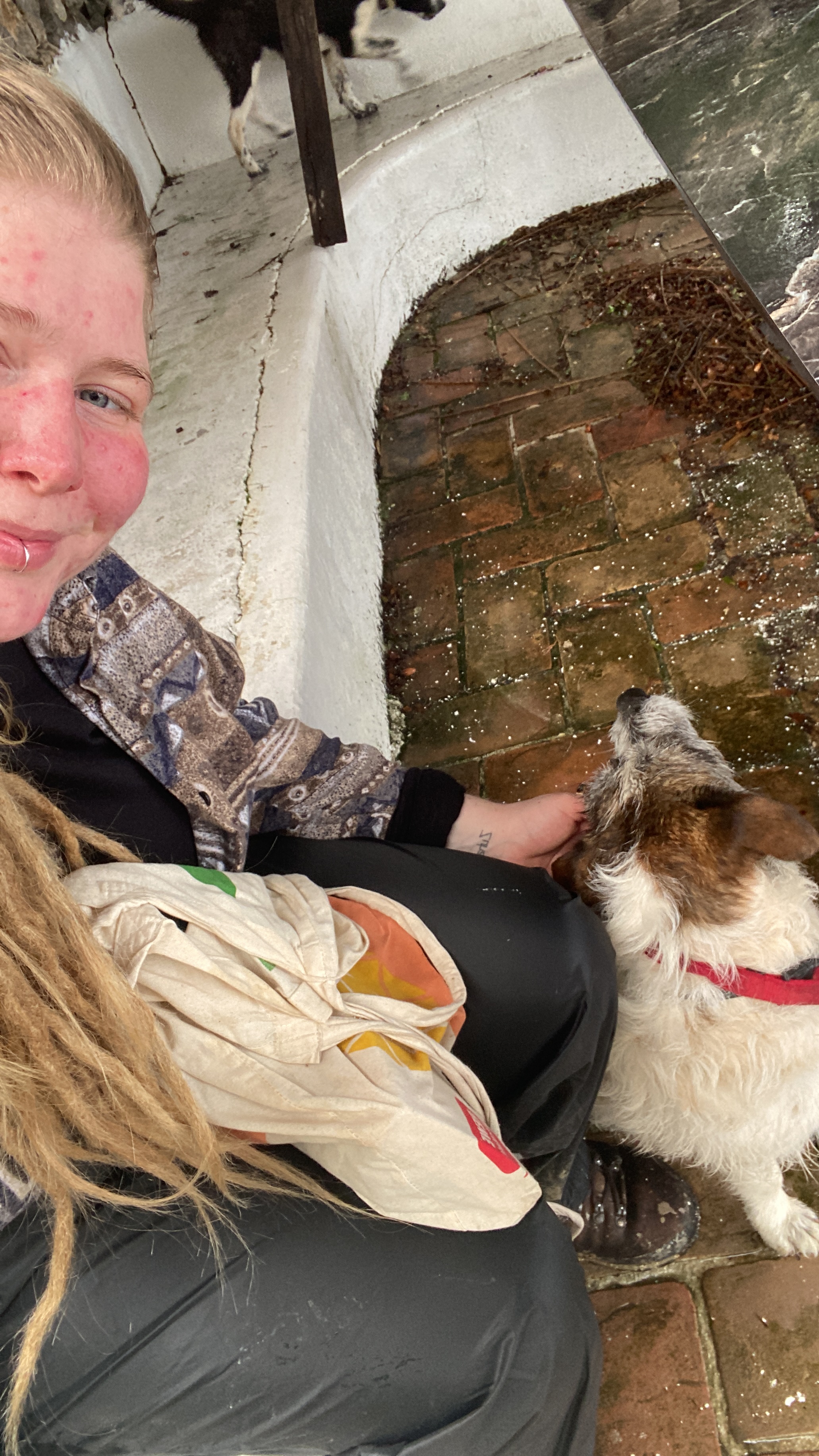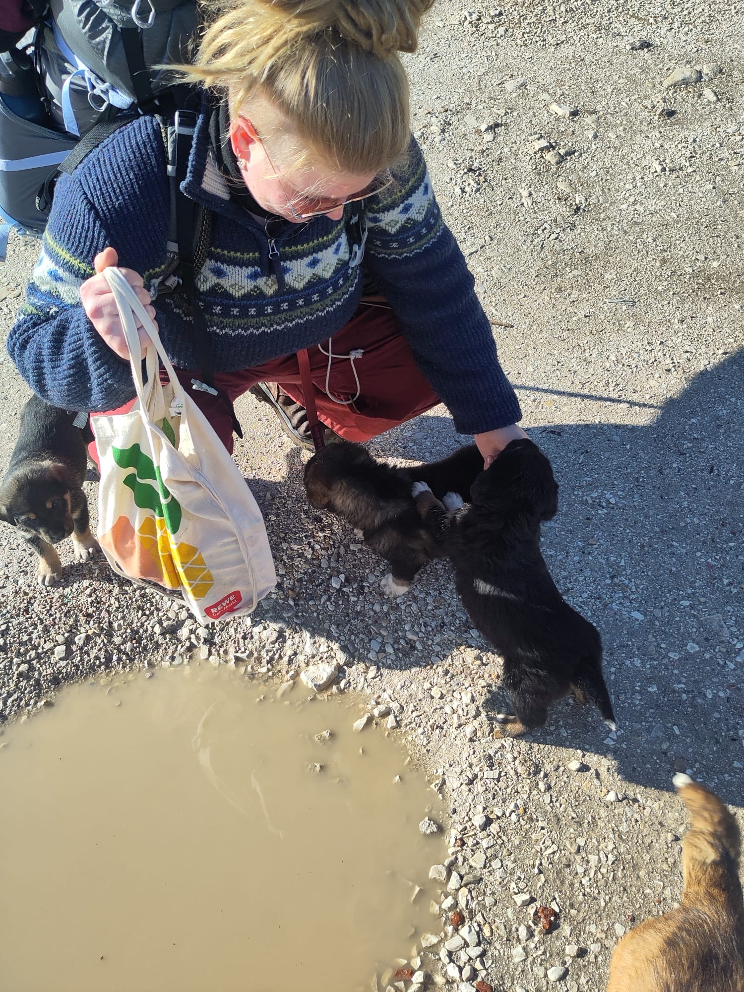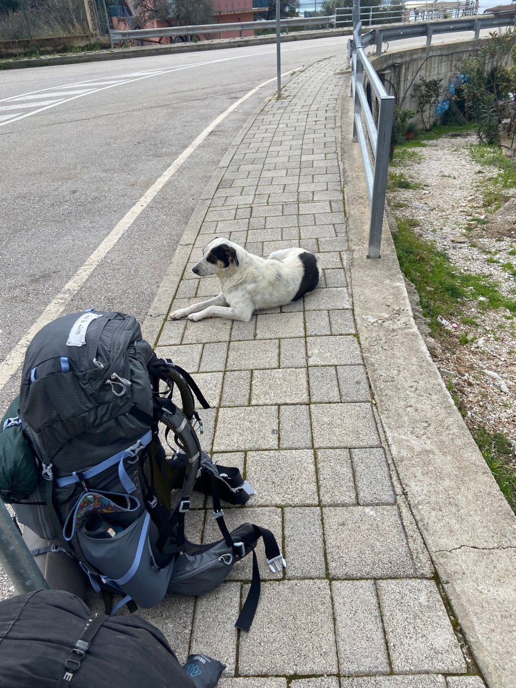 Himara war ein kleines sehr touristisch geprägtes Küstenörtchen, dennoch war es wunderschön. Wir fanden bis zum Mittag keinen weiteren Lift und entschieden den Tag, Tag sein zu lassen, eine Brotzeit unter dem schützenden Vordach eines nicht geöffneten Cafés zu machen und buchten uns für die kommenden zwei Nächte in ein Airbnb ein, denn es hatte wie angekündigt angefangen zu regnen, was sich den folgenden Tag auch genauso durchzog. Nani beschloss trotz des Regens ein wenig die Gegend zu erkunden. Das kleine Apartment gepaart mit der doch immer wieder angespannten Stimmung zwischen uns motivierte Nani für einen Spaziergang und sie passte zufällig eine zweistündige Regenpause ab. Sie beschloss einem Wanderweg zum nächsten Strand zu folgen. Dieser führte an einem Campingplatz vorbei, wo Sie von zwei süßen Hunden begrüßt wurde. Die beiden beschlossen Nani zu begleiten und schienen den Weg gut zu kennen. Begeistert von der unerwarteten Begleitung schaffte Nani den teilweise doch sehr rudimentären Weg zum Livadi-Beach und brachte die beiden Fellnassen im Anschluss auch wieder nachhause. Diese liebevolle Begegnung beschwingte Nani noch für den restlichen Tag.