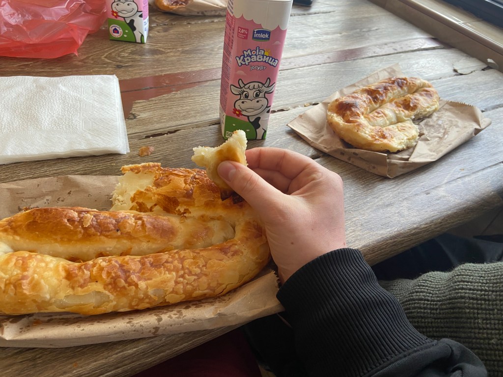 In unserer Herberge in Dubrovnik checkten wir nach einem phänomenalen Sandwich-Frühstück um Punkt zehn Uhr aus und machten uns nach einem kurzen Einkauf auf den Weg zur nächsten Trampstelle. Wir wollten nun weiter Richtung Montenegro und Albanien reisen. Tatsächlich wurden wir an diesem Tag mit einem Direktlift über fünf Stunden durch Montenegro nach Albanien gefahren. Leider haben wir damit Montenegro quasi übersprungen und konnten nur sehr wenige Eindrücke von dem Land aufnehmen. Was sich über Montenegro aber sagen lässt, ist, dass die Straßen gefühlt aus einer einzigen, riesigen Baustelle bestehen und die Umleitungen der Schnellstraßen häufig sehr abenteuerliche Schotterpisten voll mit Schlaglöchern und Bodenwellen sind. Wir machten auf dem Weg noch einen Zwischenstopp bei dem besten Byrek des gesamten Albanienaufenthalts, ironischerweise noch in Montenegro.
