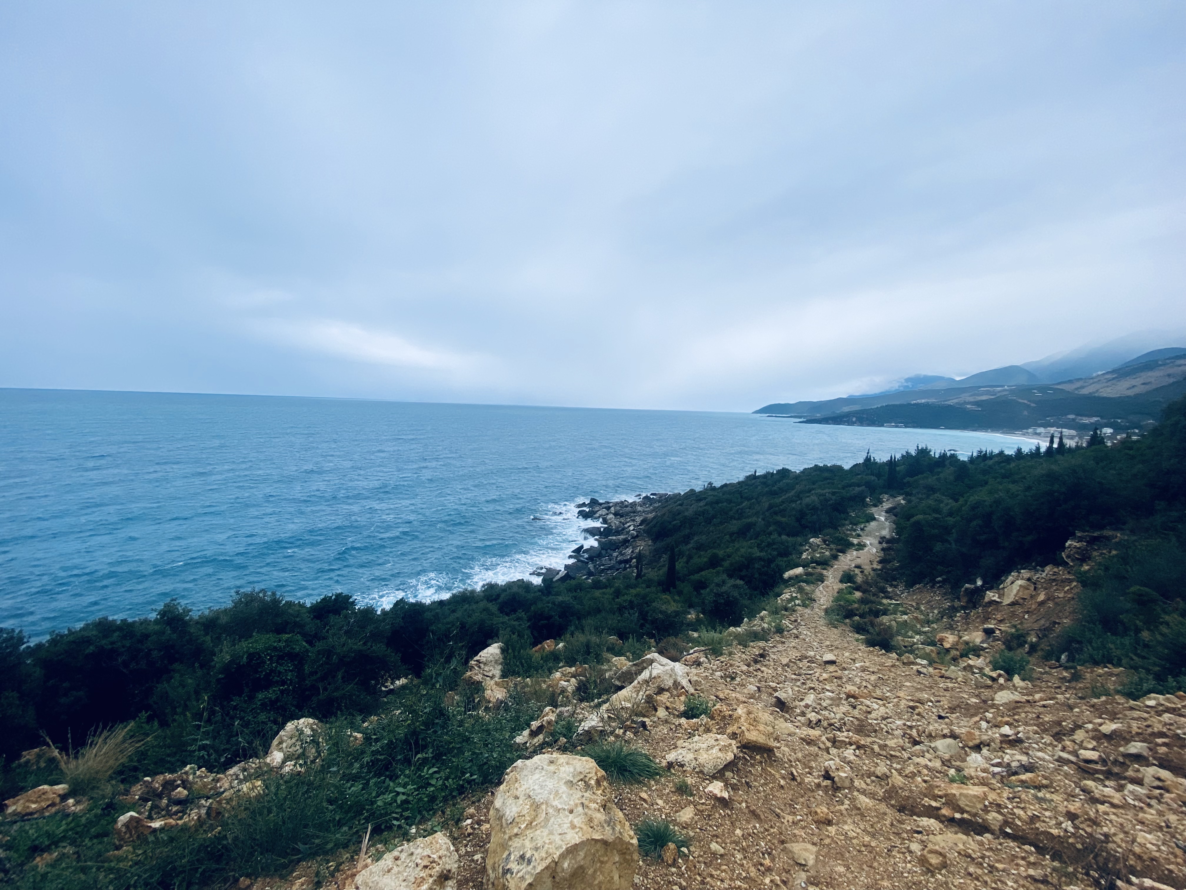 Im Dunkeln in Albanien angekommen suchten wir uns flott einen Schlafplatz. Nani war durch die Warnungen des Autofahrers über die Mentalität der Menschen hier verunsichert und die Gegend trug nicht besonders zum Sicherheitsgefühl bei, waren doch die ersten Leute, die wir abseits der Straßenbeleuchtung trafen, gerade dabei Drogen zu dealen. Auf schnellstem Wege schlugen ods und Nani sich in die Büsche und fanden glücklicherweise einen guten Schlafplatz etwas abseits der Siedlung am Rande eines Wäldchens. An unserem Schlafplatz wurden wir den Abend nur von einer Gruppe Tieren gestört, die wir nicht sehen, dafür aber jaulen hören konnten. Wir vermuteten, dass es Schakale sein könnten, doch sie hielten die ganze Nacht über respektvollen Abstand von uns. Am folgenden Morgen starteten wir aus Milot Richtung Vlora. Wir kamen ganz gut voran und hatten die ersten wirklich netten Begegnungen mit den Menschen in Albanien. Nani konnte zum Glück ihre abendliche Angst und ihre Vorurteile abschütteln! In Vlora gingen wir unserem Ritual des Ankommen und Kaffeetrinkens nach und stellten dabei fest, wie absurd günstig Essen, Unterkunft und Leben aus deutscher Perspektive hier ist. Wir buchten uns deshalb kurzerhand in ein Apartment ein und ersparten uns die Suche nach einem Schlafplatz in einer recht großen Stadt. Das ist erfahrungsgemäß immer sehr nervenaufreibend und meist auch nur mäßig zufriedenstellend. Verwirrt irrten wir also durch die Straßen von Vlora auf der Suche nach der Adresse unserer Unterkunft, als uns ein nettes älteres Paar auf englisch ansprach und fragte, ob wir Hilfe bräuchten. Tatsächlich waren wir etwas verloren und ohne umschweife rief der albanisch sprechende Mann unsere Hostin an und machte einen Treffpunkt aus, an dem sie uns abholen würde. Seine Begleitung erzählte, wie schwer es auch ihr falle hier Adressen zu finden, insbesondere wenn man die Landessprache nicht beherrscht. Sie selbst kam aus Russland und war aufgrund des Krieges seit ein paar Jahren in Vlora. Gerührt von der unkomplizierten Hilfsbereitschaft gingen wir zum ausgemachten Treffpunkt und wurden kurz danach abgeholt. Wir hätten die Adresse alleine wohl niemals gefunden, auch da unsere Hostin kaum englisch sprach. Wir checkten beseelt ein, kochten unser Abendessen und Nani machte ihre abendliche Runde Yoga, bevor wir glücklich und erschöpft ins Bett fielen. Am kommenden Tag wollten wir früh aufstehen um möglichst schnell weiter zu kommen. Der Wetterbericht sagte die nächste heftige Regenfront voraus, die dann auch einen gesamten Tag anhalten sollte. Unser Ziel war es also möglichst schnell in den Süden Albaniens zu gelangen. Viel zu früh standen wir am folgenden Morgen auf, nur um mal wieder von den Trampergöttern ausgelacht zu werden. Den gesamten Morgen standen wir an einer Stelle und kamen nicht voran. Erst gegen 10 Uhr nahm uns jemand mit aus der Stadt und wir sollten es mit unserem Lift auch nur bis Himara schaffen. Dafür war unsere Mitfahrgelegenheit ein wirklich lieber Mann der extra für uns die schönere Route über den Bergpass nahm. Nani hatte gelesen, dass diese Route einen grandiosen Ausblick versprach, doch war sie zuvor wenig zuversichtlich gewesen, jemanden zu finden, der diese Route nehmen würde, denn vor zwei Jahren wurde ein wesentlich schnellerer und komfortablerer Tunnel gebaut, welcher nun die Hauptverkehrsverbindung darstellte. Glücklich über das Angebot nahmen wir es begeistert an und konnten die Landschaft Albaniens ein weiteres Mal bestaunen. Der Fahrer hielt am besten Aussichtspunkt extra für uns an, damit wir die Aussicht genießen konnten.