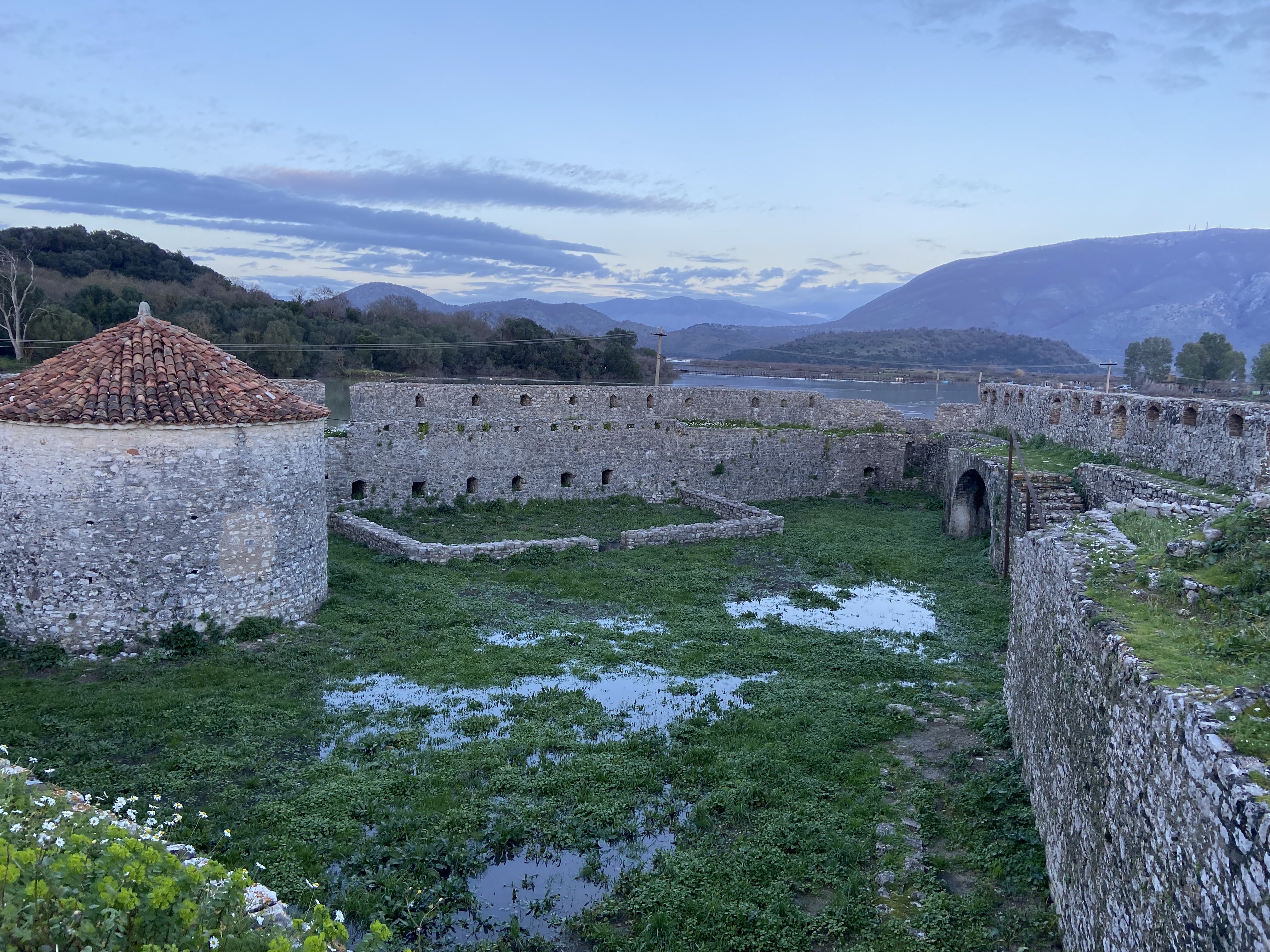 Unser Tagesziel hatten wir allerdings noch nicht erreicht. Von Saranda aus war es nur noch ein Katzensprung nach Butrint, einer besonders bekannten Sehenswürdigkeit in Albanien, die wir als heutiges Tagesziel rausgesucht hatten. Nani wollte hier unbedingt hin und hatte gelesen, dass es einen wirklich günstigen Bus gäbe. Der Fahrplan war online allerdings nicht auffindbar und es gab verschiedene Angaben zur Häufigkeit der Fahrten außerhalb der Saison. Wir stiefelten also auf gut Glück zu einer der Bushaltestellen und warteten eine Weile, jedoch ohne Erfolg. Letztlich liefen wir Richtung Ortsausgang um doch zu trampen und stellten unterwegs fest, wieso kein Bus an dieser Haltestelle hielt. Die Straße war aufgrund von Bauarbeiten komplett gesperrt und der Bus nahm eine andere Route als gewöhnlich, was allerdings nirgendwo angegeben war. Wir fanden glücklicherweise noch ein Auto mit zwei liebenswürdigen Frauen, die uns direkt nach Butrint nahmen. Dort angekommen fanden wir den bisher wohl coolsten Schafplatz unserer Reise: eine Burg auf der anderen Seite des Flusses sollte unser Nachtlager werden! Dort kamen wir mit einer kleinen, klapprigen Seilzugfähre hinüber. In der Burg wurden wir abends erfolgreich unentdeckt eingeschlossen und verbrachten die Nacht sicher vor Regen und ungewolltem Besuch in der Burg.