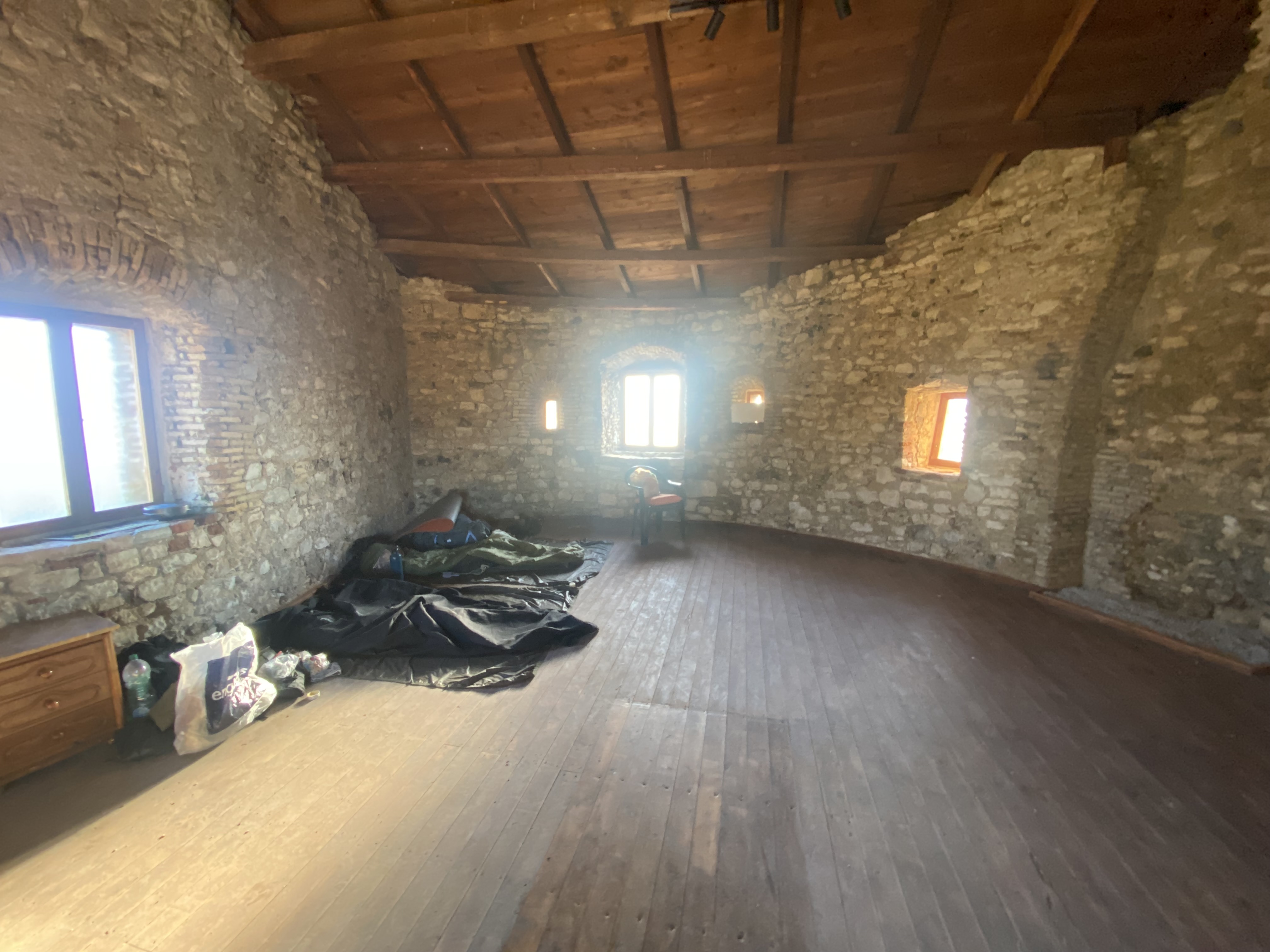 Gegen Mittag standen wir an der wirklich wenig befahrenden Straße und hatten zunächst kein Trampglück. Doch plötzlich war aus der Ferne ein Camper auszumachen und Nani erkannte das Auto sofort: Es war die französische Familie, die uns bereits in Butrint aufsammelte und nun auf dem Weg nach Griechenland war. Schon bei unserer ersten kurzen Begegnung erzählten Sie, in den kommende Tagen über die Grenze zu wollen und wir hatten gewettet sie bestimmt noch einmal zu treffen. Sie retteten uns also ein zweites Mal aus unserer etwas vereinsamten Lage und brachten uns a die Hautspraße Richtung Gjirokaster. Dort gelangten wir dann recht schnell mit zwei weiteren Lifts in den Ortskern und liefen schnurstracks zum Hotel Fantasy wo wir den Abend zuvor ein Zimmer gebucht hatten. Die Preise waren erstaunlich erschwinglich und das Frühstück des Hotels wurde im Internet in den höchsten Tönen gelobt und war bereits im Preis inbegriffen. Von dem wirklich guten Angebot verleitet, gönnten wir uns den Luxus und wurden nicht enttäuscht! Es ist immer eine Umstellung, von der Straße und dem Wald, in dem wir zuletzt schliefen, plötzlich in einem schicken Hotel anzukommen und wir fühlten uns auch diesmal mit unseren nicht ganz sauberen Rucksäcken und nach Natur riechend etwas fehl am Platze. Doch das Hotel war wunderschön, das Zimmer ein Traum und die Aussicht über die Stadt beeindruckend. Nach einem gemeinsamen Abendessen in einem sehr guten Restaurant mit entspannt-hippiesker Musik, verbrachte Nani den Abend im Videocall und ods testete die Hotelbar, die allerdings sehr verlassen war.