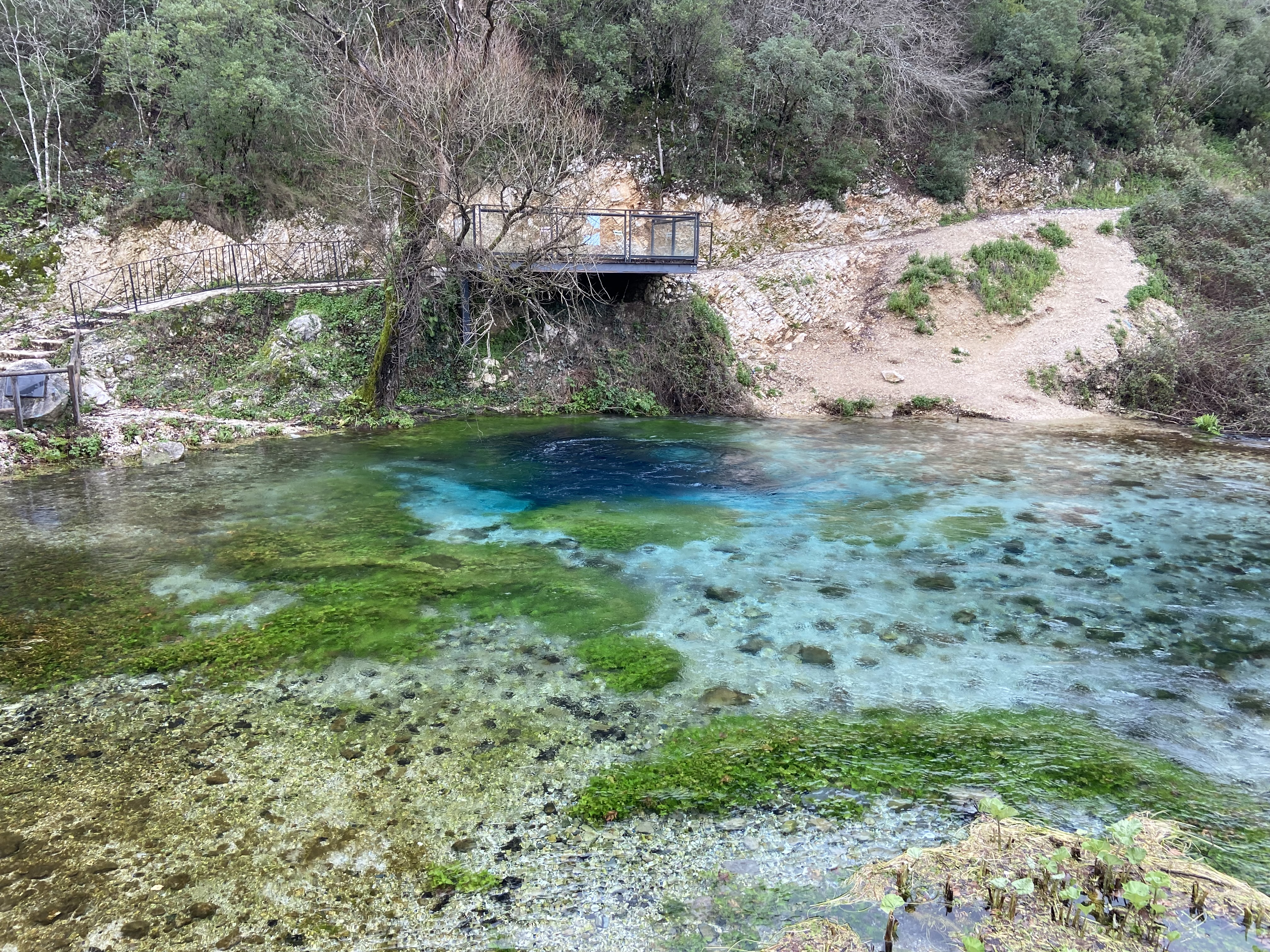 Es wurde spät und wir mussten, gegen die einbrechende Dunkelheit laufend, noch schnell einen Lift zum sogenannten „Blauen Auge“ finden! Dieses Naturspektakel war eine wunderschöne, natürliche Quelle, welche aus einem mindestens 50 m tiefer Loch entspringt. Sie lag etwas abseits, aber dennoch quasi auf dem Weg Richtung Griechenland und wir hofften dort in der Nebensaison einen ungestörten und geschützten Schlafplatz zu finden. Entgegen aller Wahrscheinlichkeit nahm uns tatsächlich ein Auto mit und dazu war die Fahrerin auch noch aus Kassel, Deutschland, und riet uns, auf jeden Fall einen Abstecher nach Gjirokaster zu machen. Sie empfahl uns ins Hotel Fantasy einzuchecken und in der Altstadt einen Mokka zu trinken. Wir wollten ihrer Empfehlung gerne folgen, hatten wir doch bereits vorher überlegt, den Ort anzusteuern, auch wenn er nicht direkt auf dem Weg nach Griechenland lag. So nahmen wir uns vor, den kleine Abstecher am nächsten Tag zu machen. Die Kasselerin setzte uns am Parkplatz des Blauen Auges ab. Als wir kurz etwas orientierungslos nach dem richtigen Weg suchten, wies uns ein uniformierter Ranger die Richtung und wir wanderten das kurze Stück den See entlang. Dort angekommen fanden wir einen perfekt vor Regen geschützten Schlafplatz unter dem Vordach eines im Winter geschlossenen Cafés und hatten sogleich gute Gesellschaft durch die örtliche Katze, die wir Flecki tauften. Sie schlief diese Nacht tatsächlich mit uns zuerst auf uns und später zwischen uns unter der Kohtenbahn und wich uns, bis wir am nächsten Tag aufbrachen, auch nicht mehr von der Seite.